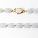 Forming a row of stones, blue chalcedony are carved, pierced and connected by fine gold rings.